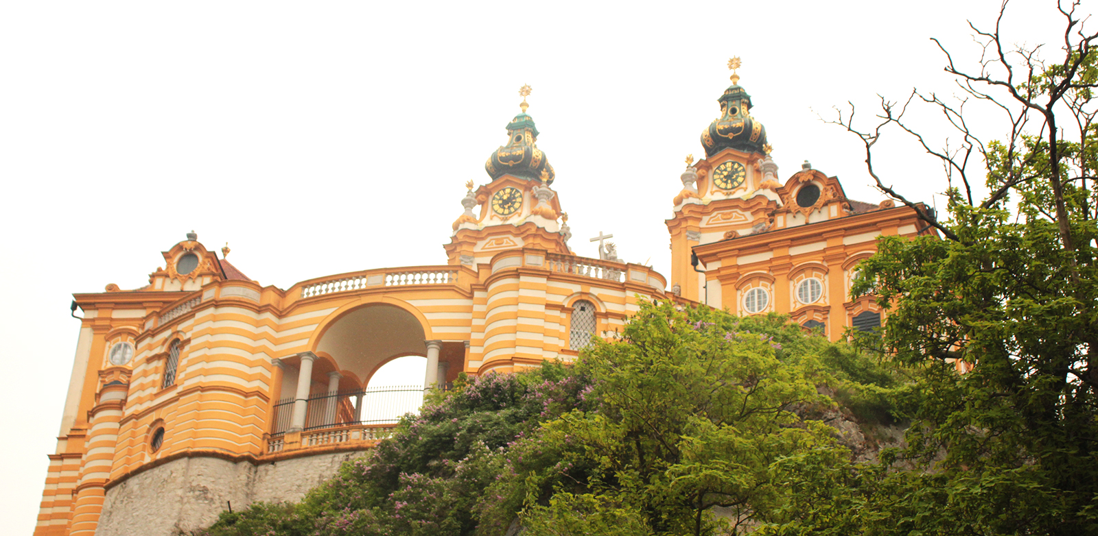 Je prend le train de direction de Melk. En arrivant à la station, un grand bâtiment dans les tons ocre s’impose, surplombant le village. Il s’agit de la fameuse abbaye de Melk. En descendant du train, je suis accueillit avec des effluves de Lilas.