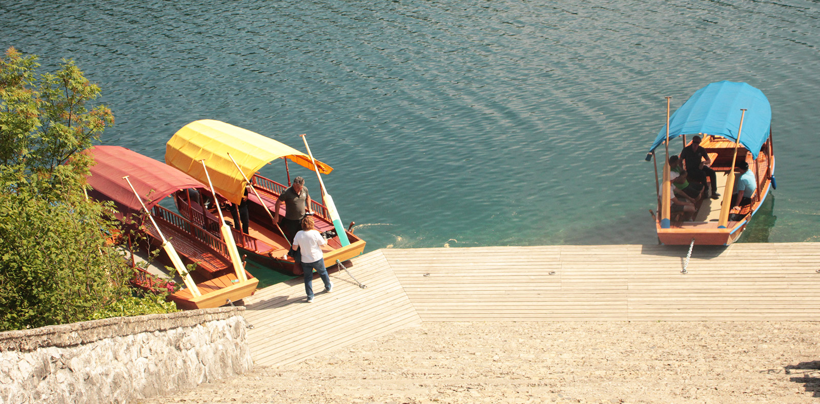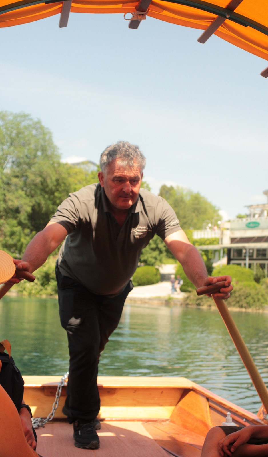 Pour y accéder à l’île, je monte à bord d’une Pletna, bateau en bois traditionnel, recouvert d’une toile de couleur. Le gondolier nous mène à L’île.
