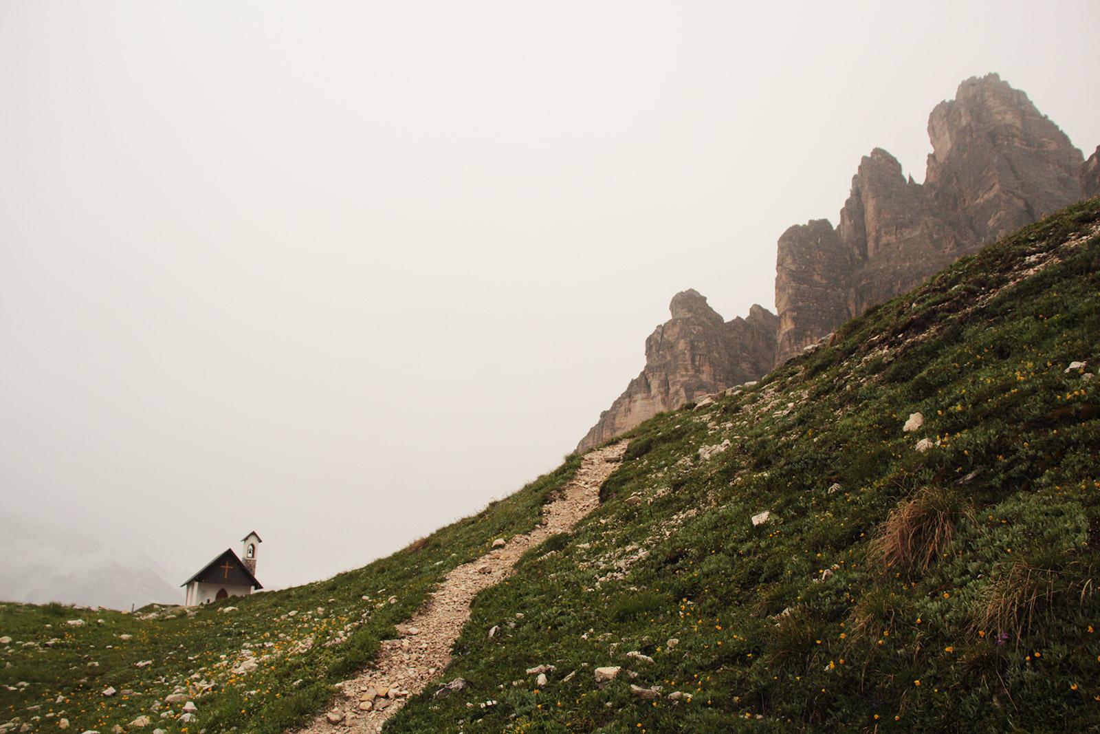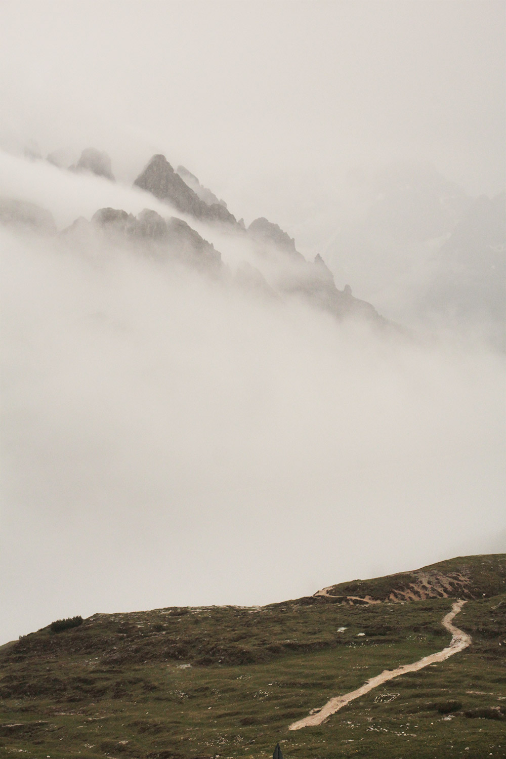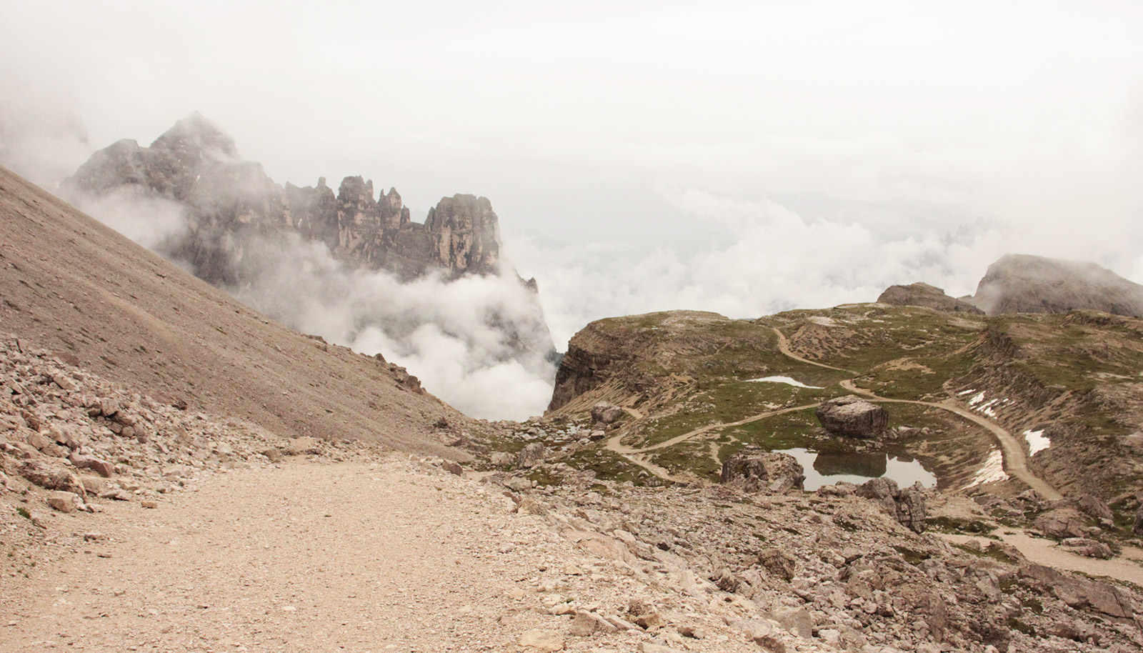 Les nuages caches un peu les montagnes, ce qui leur donne un côté mystérieux. Même sous la pluie, je suis émerveillé par tant de beauté que nous offre la nature. Je suis presque seule ici, à marcher et contempler cette immensité. Le sentier passe tout autour du Tre Cime.