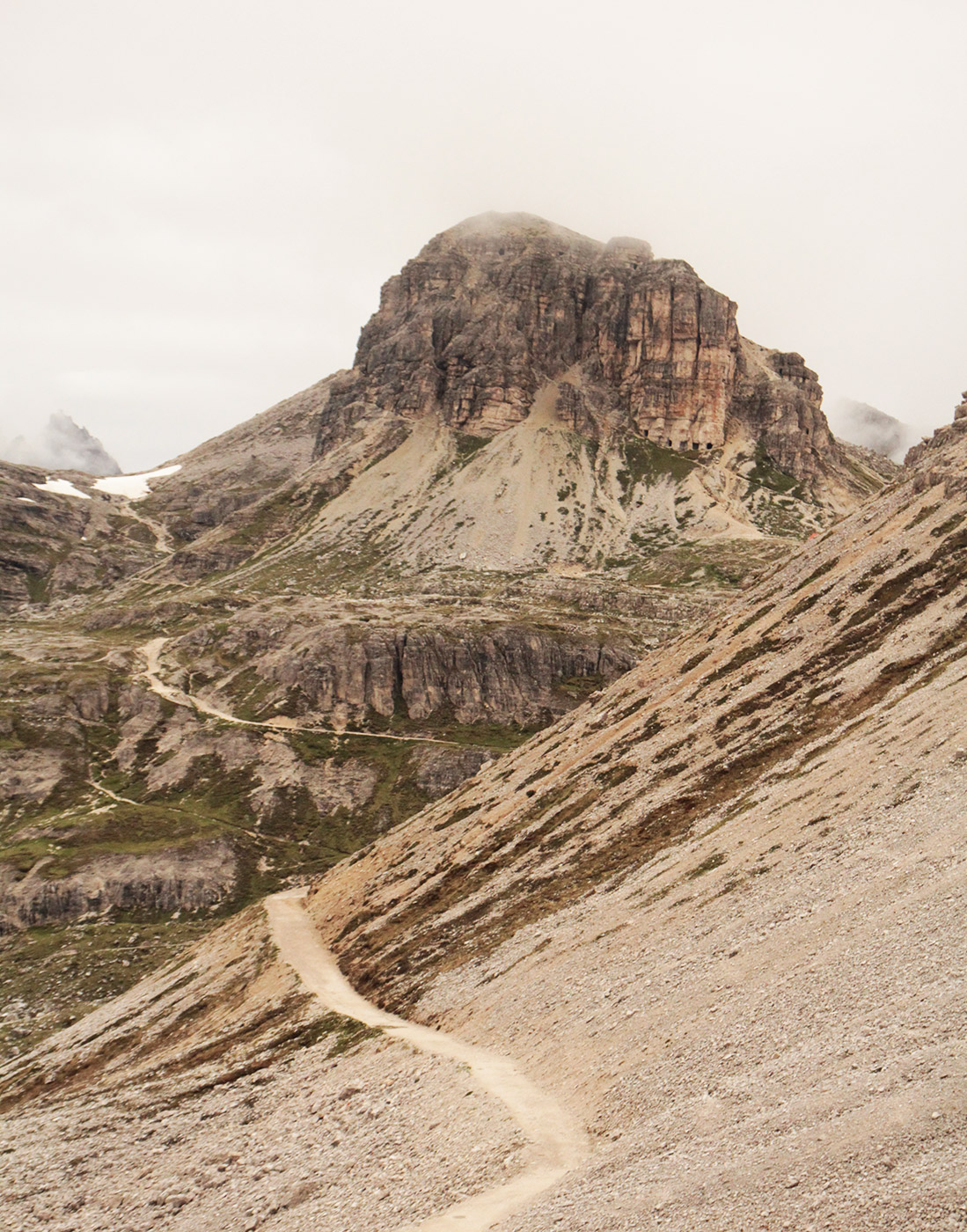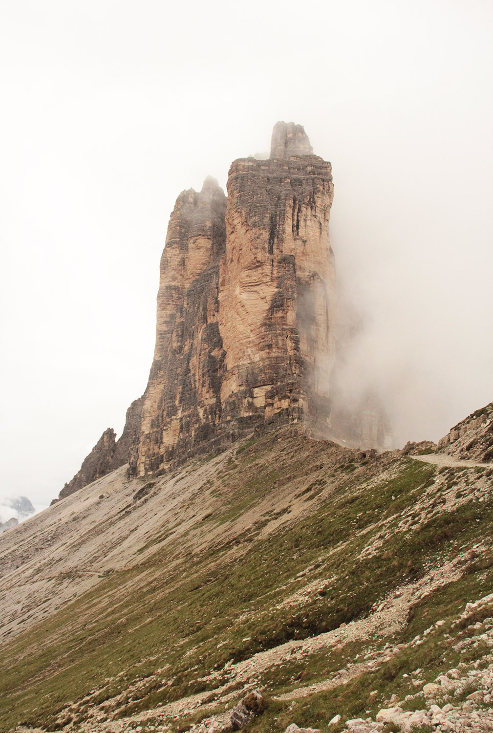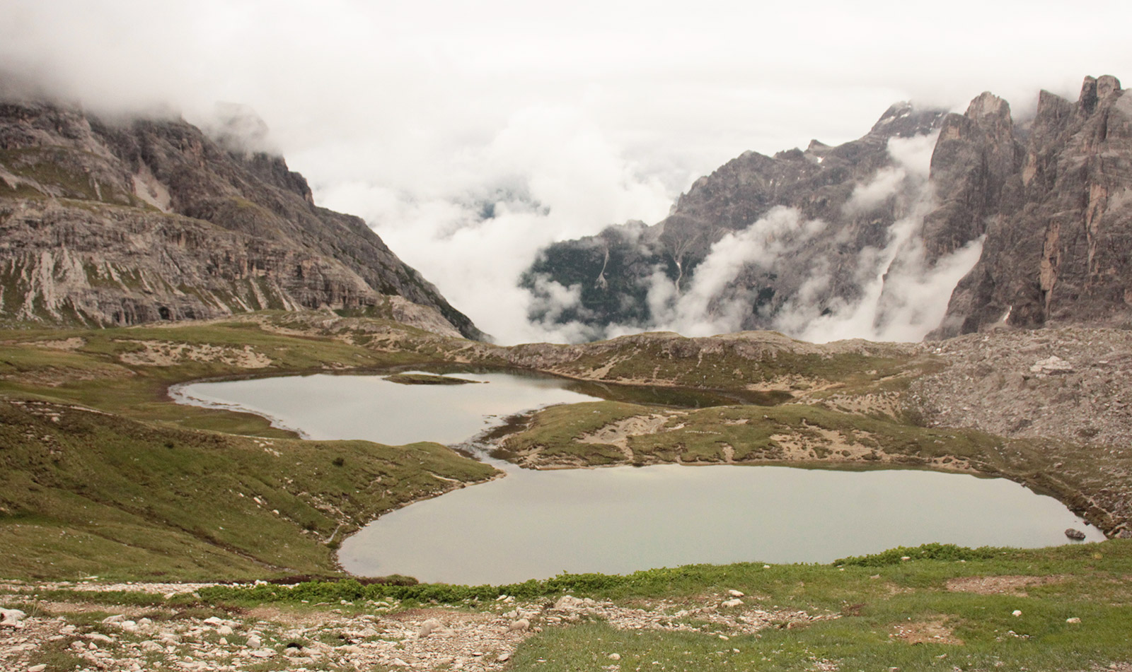 Les nuages caches un peu les montagnes, ce qui leur donne un côté mystérieux. Même sous la pluie, je suis émerveillé par tant de beauté que nous offre la nature. Je suis presque seule ici, à marcher et contempler cette immensité. Le sentier passe tout autour du Tre Cime.