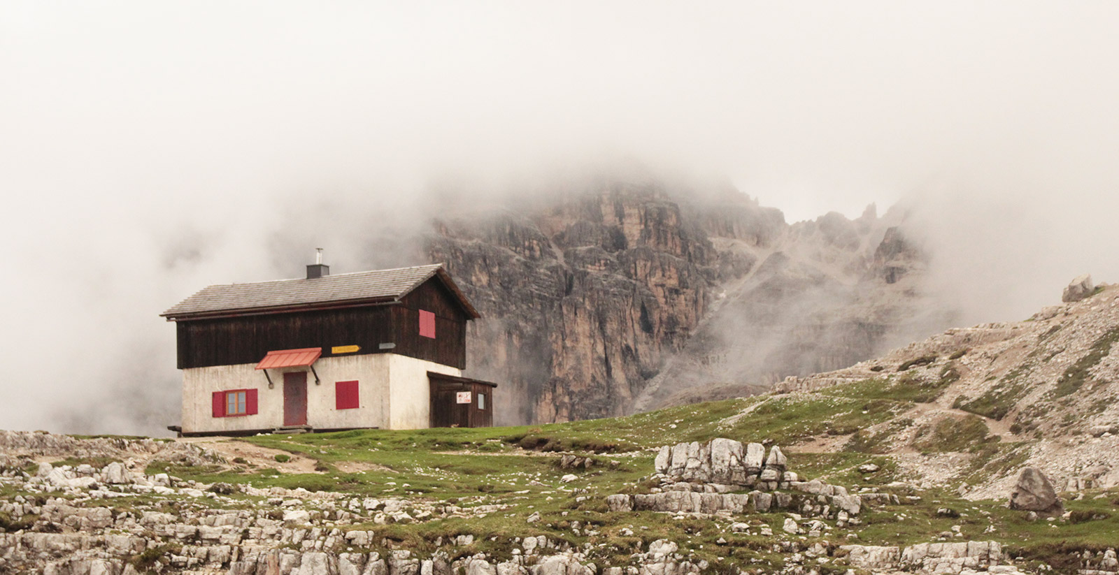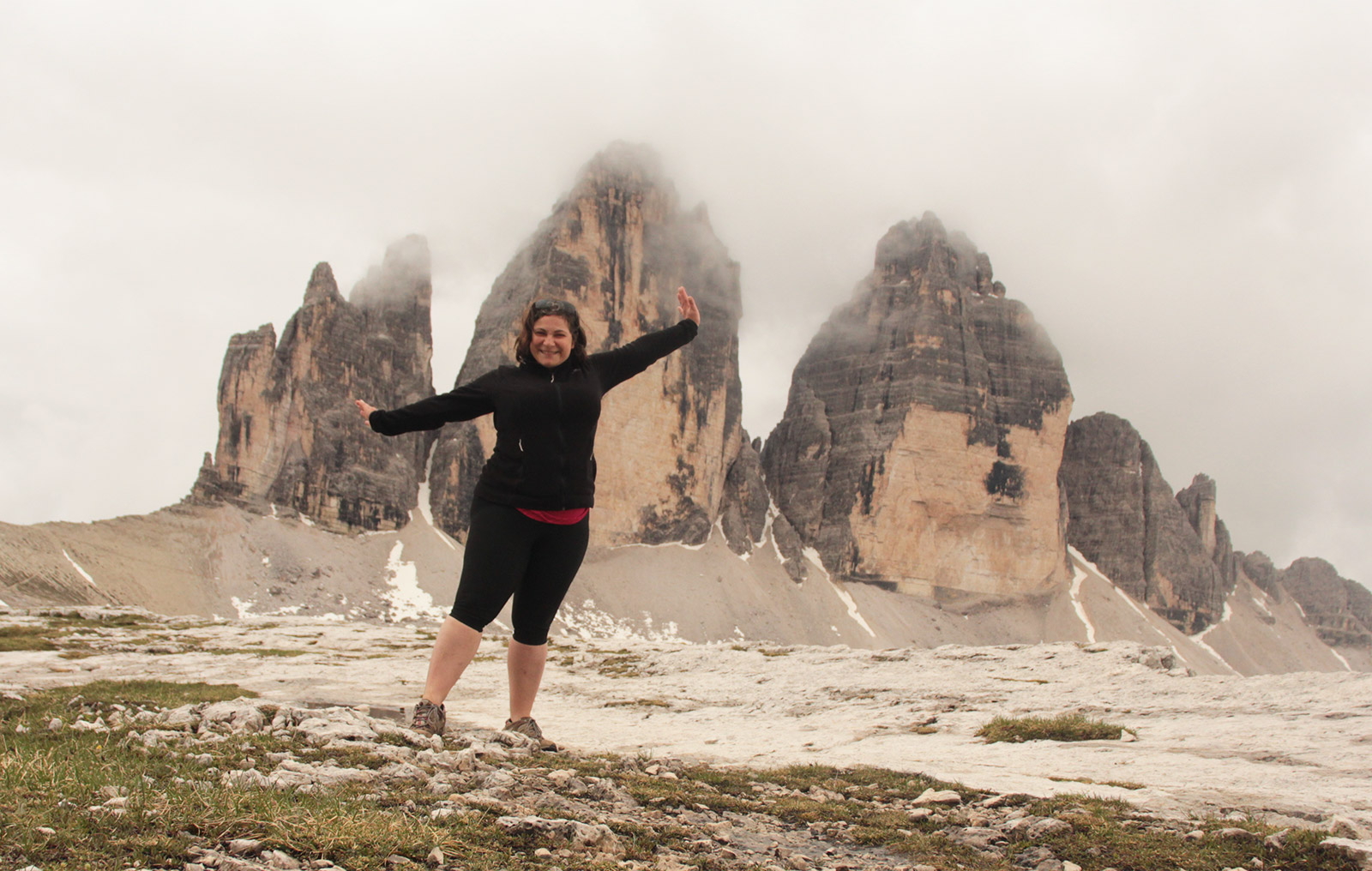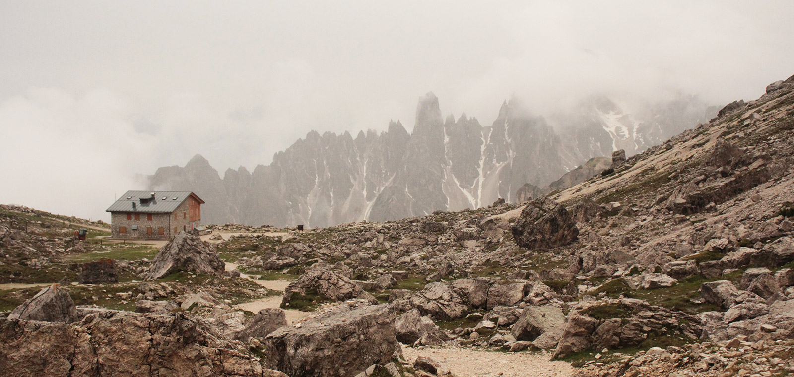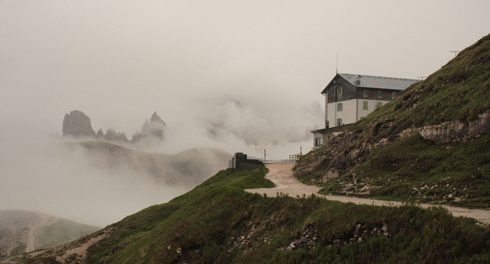 C’est au Dreizinnenhütte, (refuge), que j’arrive à la fameuse vue des Tre Cime. Il ne pleut plus, les nuages se sont un peu dissipé, et me révèlent les magnifiques sommets. À mon départ, je vois de plus en plus de personnes venu l’admirer.
