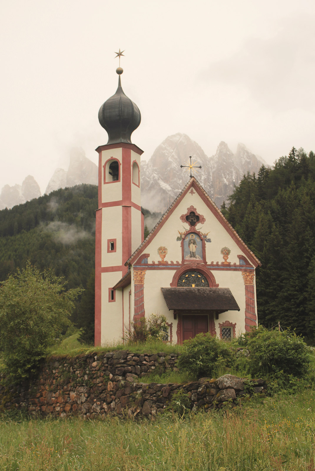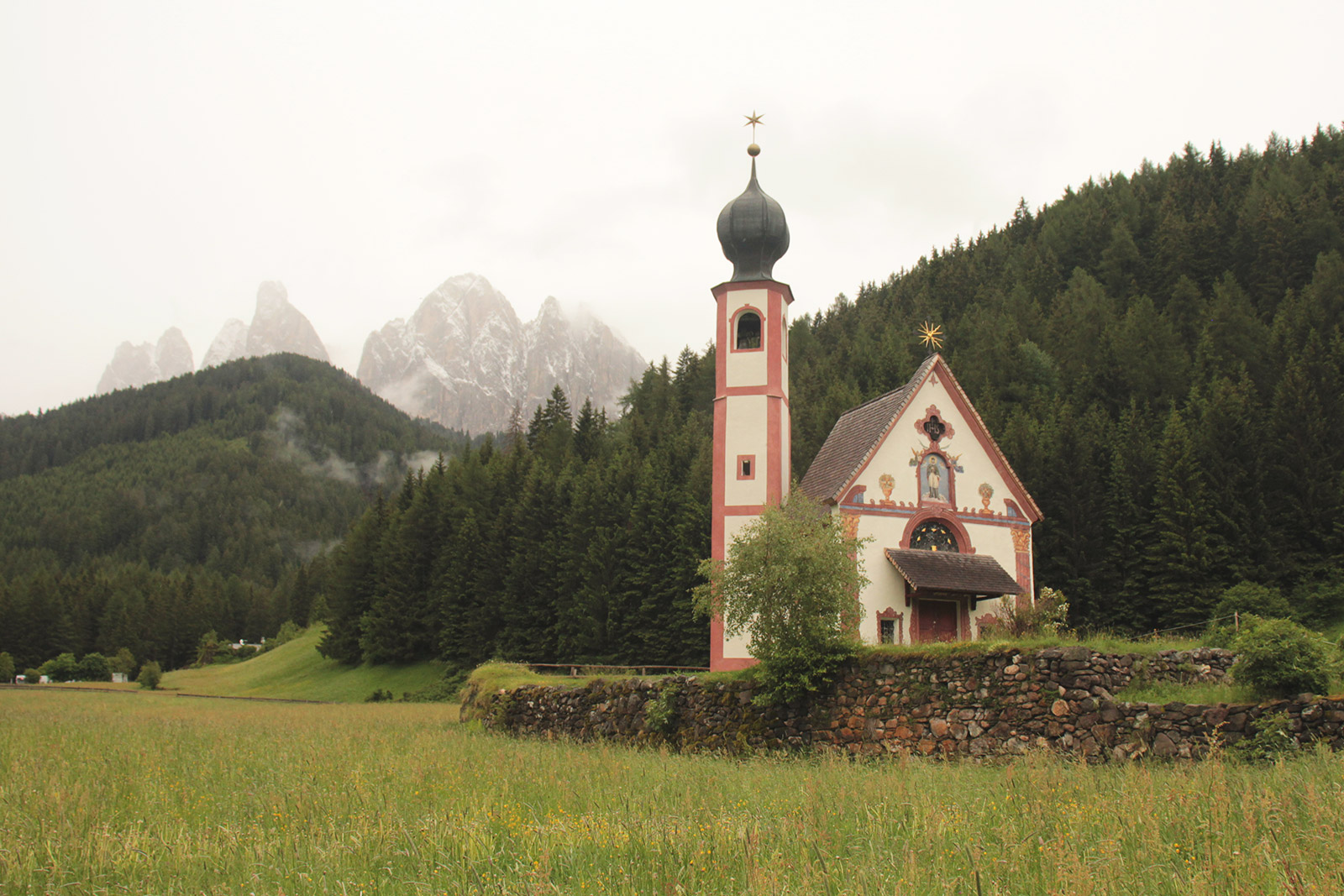 Ce jour là, le temps n’est pas très clément. Je commence ma visite par la somptueuse petite église de San Giovanni, au style baroque. Malgré le temps, la vue est splendide. J’ai un peu moins de chance lorsque j’arrive au point de vue sur Santa Maddalena. Les montagnes se font timide derrière leur rideau de nuages.