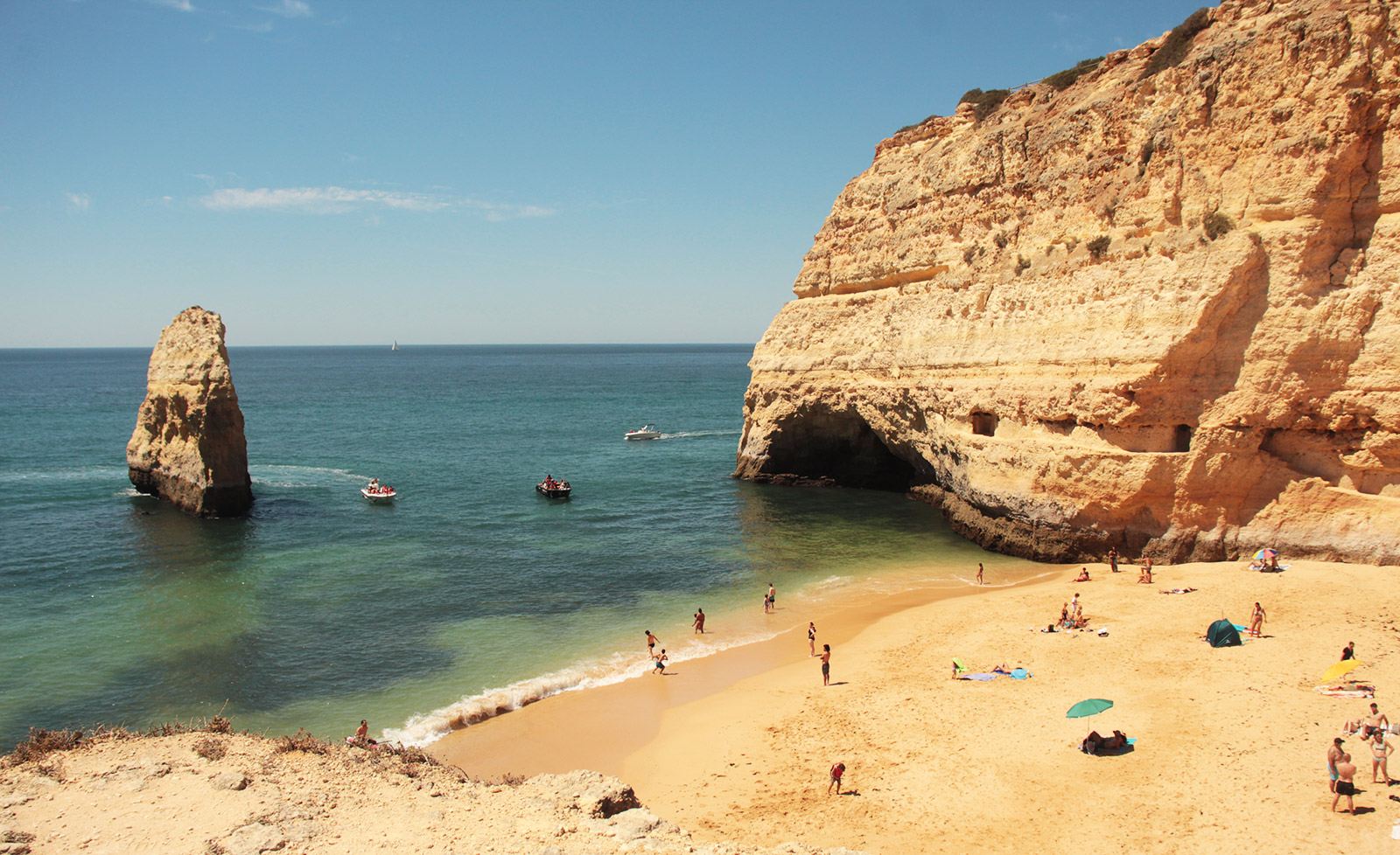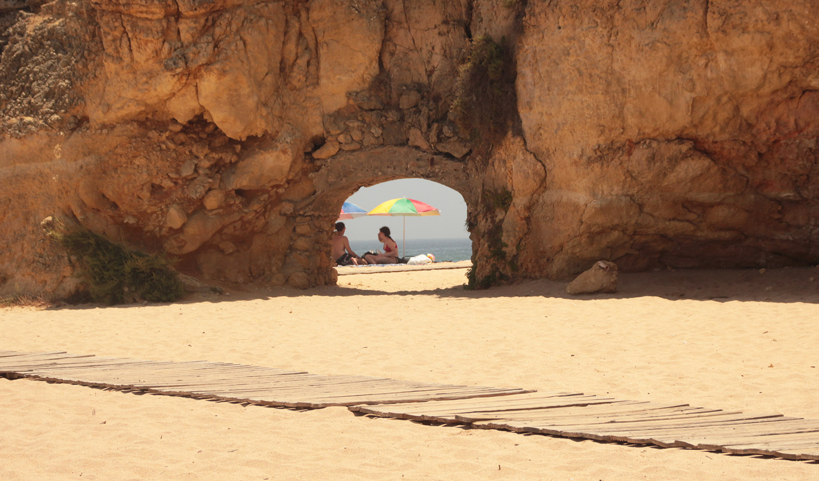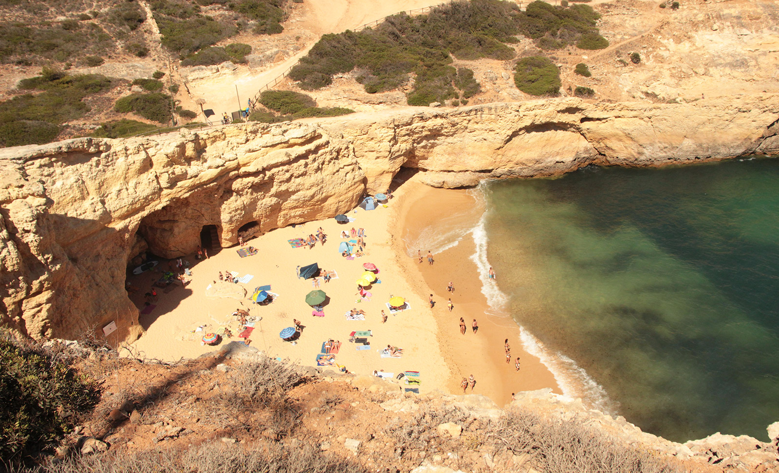 Une première beauté de cette côte, la plage de Carvalho, une crique de contrebandiers. Pour y accéder, il faut emprunter des escaliers étroit qui traversent la falaise ! Ici, il n’y a aucune commodité, mais sa beauté est extraordinaire. Falaise ocre, eaux claire Turquoise, sable fin. Quelques passages dans la falaise avec de petites fenêtre donne une ambiance mystérieuse.