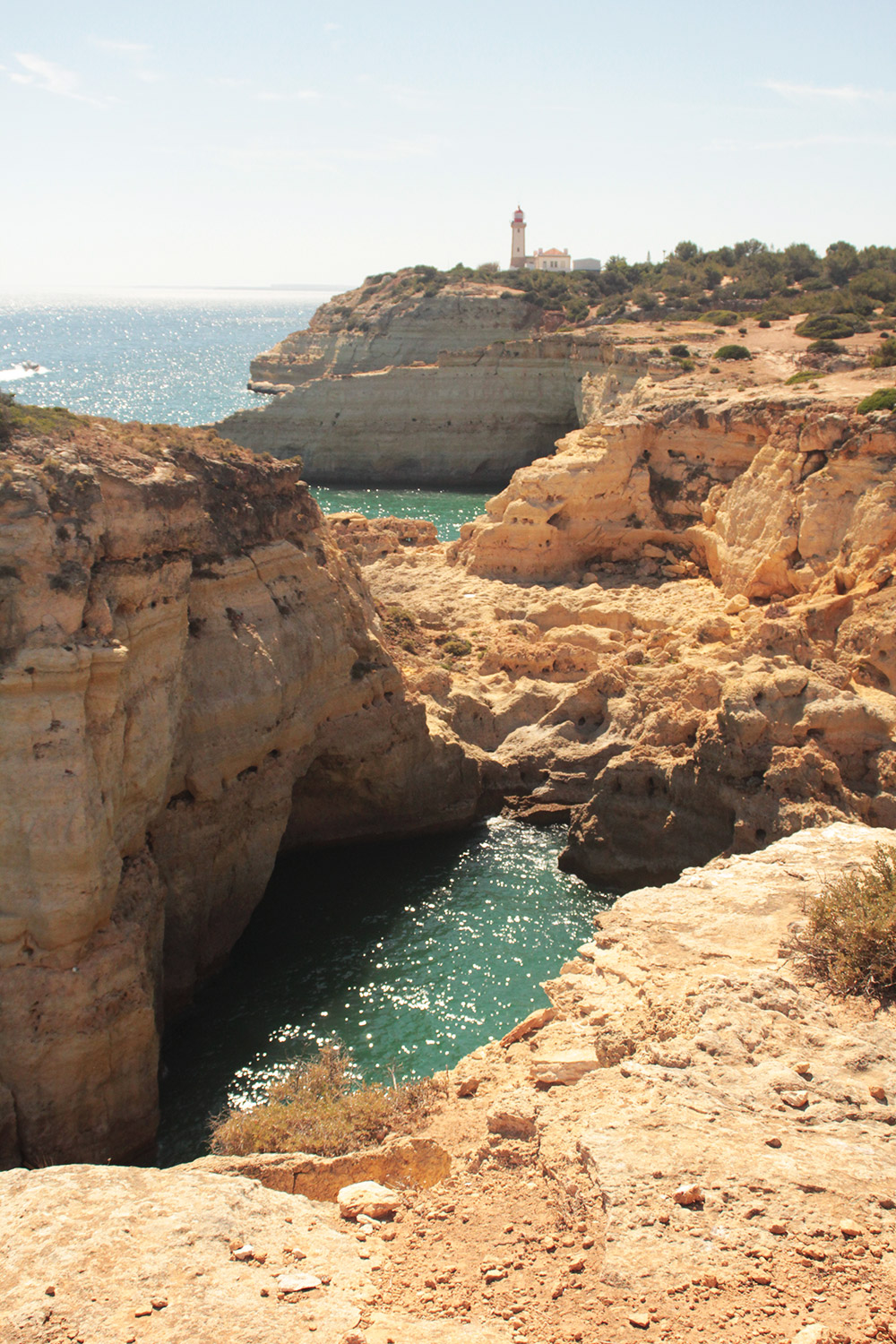Je reprend le sentier du littoral pour faire demi tour, et je continue mon ascension pour rejoindre Vale Covo, une autre plage magnifique typique de la région. En chemin, je suis émerveillé par les paysages, grottes, arches, le phare de Alfanzina, d’autres plages, mer turquoise, falaises ocre.