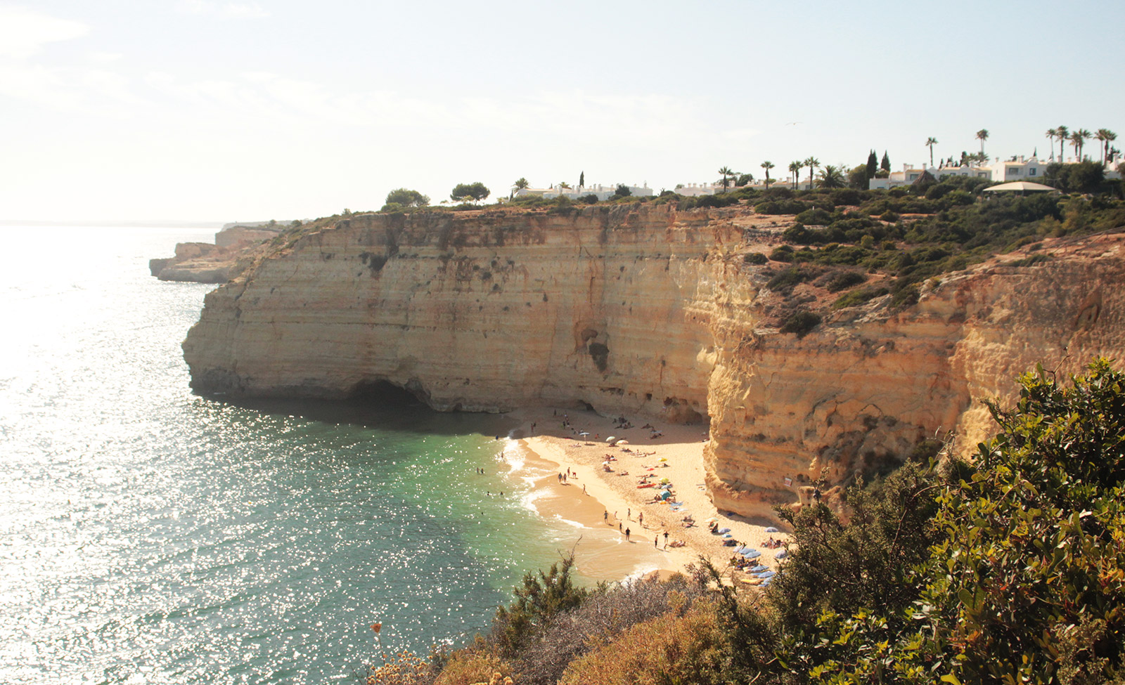Après une petite baignade, je marche le long du sentier en bord de falaise pour rejoindre Benagil, sous un soleil tapant, avec de superbes panoramas.