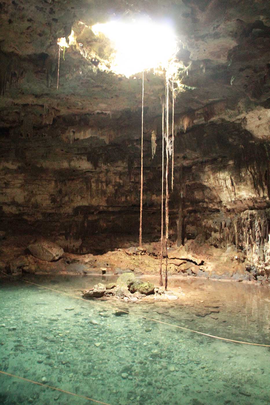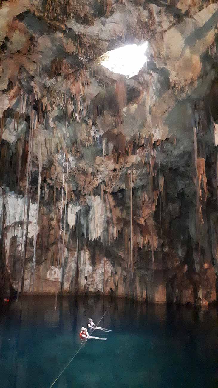 J’explore ensuite la cenote de Xkeken. C’est aussi une grotte, avec un puit de lumière plus petit. C’est l’une des plus grande de la région, et l’une des plus belle. Elle est bordée de stalactites et de formation de calcaire. Des racines d’arbre descendent pour absorber l’eau. De petites chauves souris y vivent. L’endroit est tous simplement magique. J’ai eu la chance d’être presque seule pendant environ 15min, et je me delecte, flottant dans l’eau, profitant du calme et de ce lieu unique.