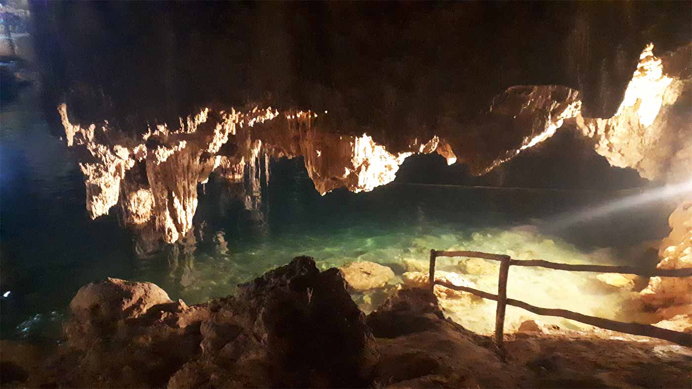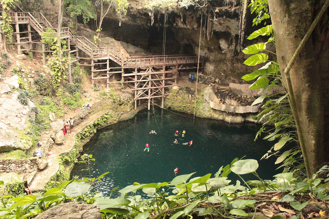 Je commence ma visite par la cenote Samula, une grotte avec un puit de lumière. Je dois dire que je suis émerveillé. Quelques personnes, la cenote n’est pas encore trop achalandé. Je me baigne dans l’eau fraiche et cristalline. De petits poissons y vivent. Assise sur le rebord, les pieds dans l’eau, comme d’autres touristes, je laisse les petits poissons me faire une pédicure, tout en riant, car ça chatouille!